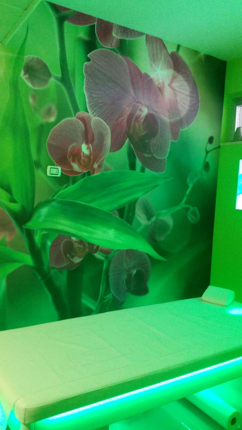 E’ stato deciso di adottare duo motivi grafici differenti: per la decorazione delle colonne un motivo di mattoni faccia a vista con ampie fughe chiare, praticamente una carta da parati moderna con effetto 3D, mentre per la cabina una carta da parati floreale, riproducente splendide orchidee.