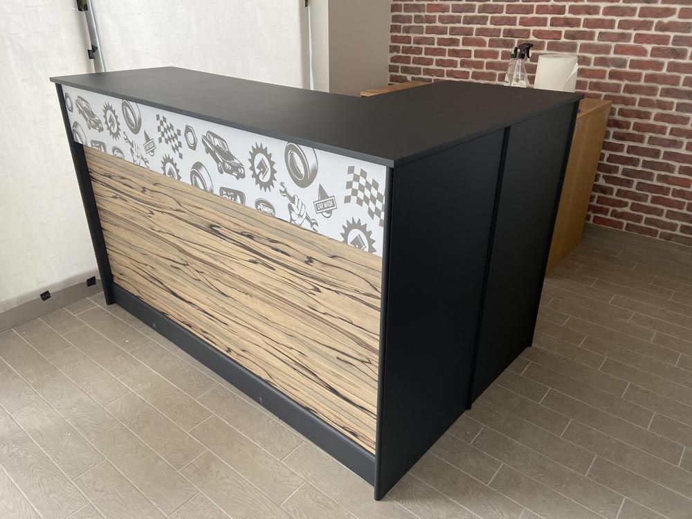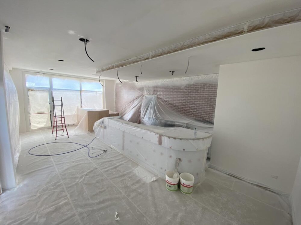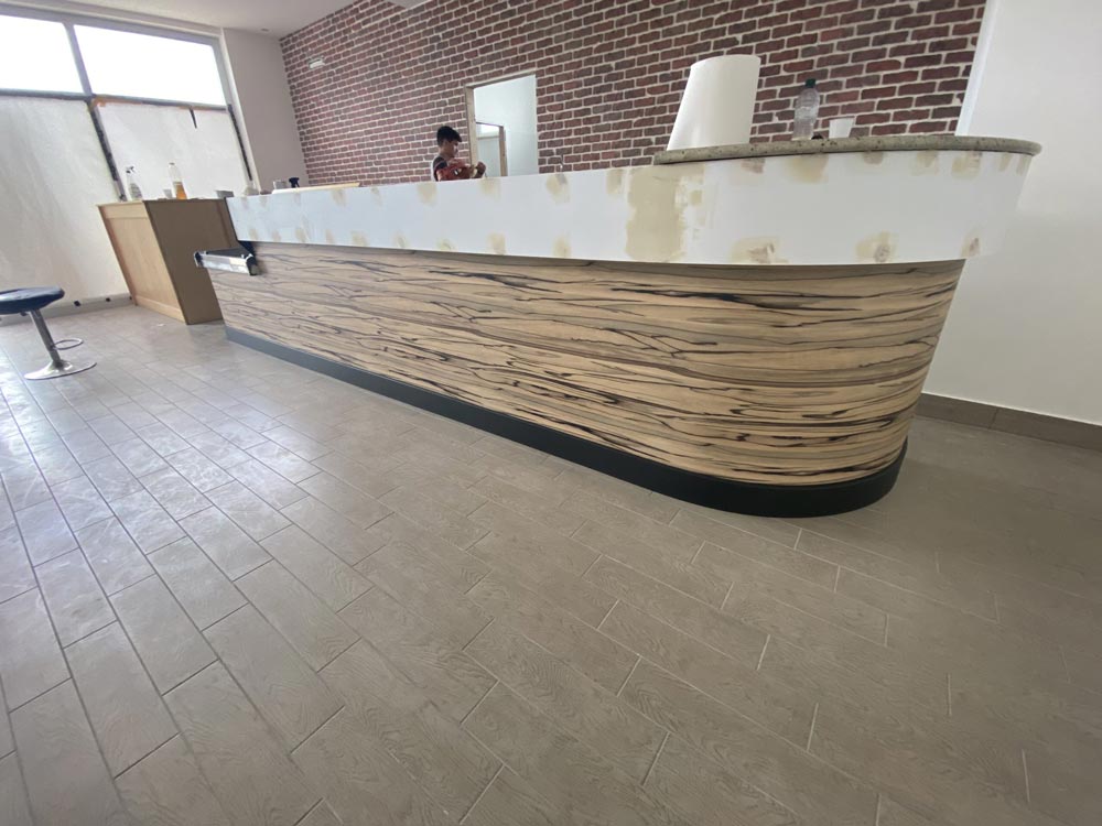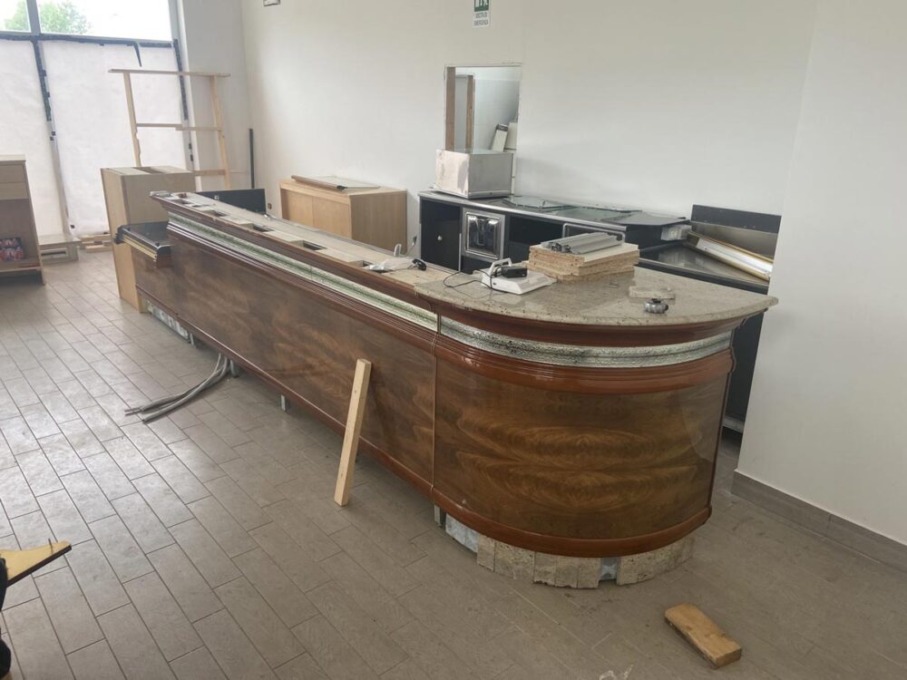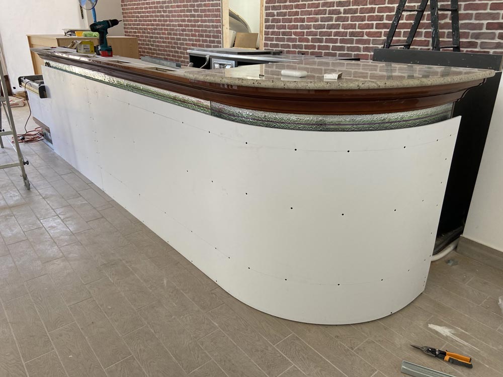 Nelle foto seguenti si può vedere lo stato d’avanzamento con il nuovo rivestimento grazie al quale è stato possibile conferire il nuovo look al bancone del bar.