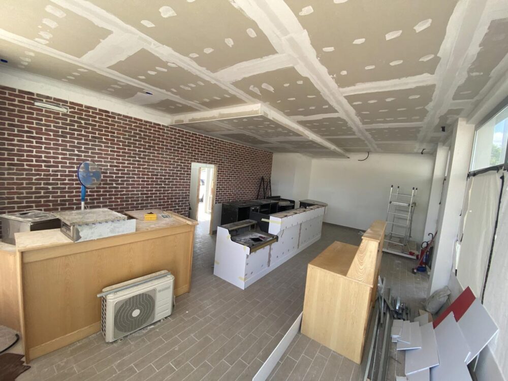 Dalle foto si vede il locale interamente vuoto da cui si è partiti, con l’inizio dei primi lavori edili e l’inserimento del bancone bar, abbastanza datato e del banco cassa.