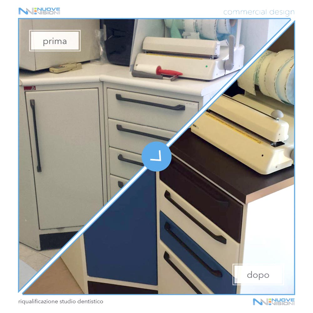 Per il rivestimento degli arredi dello studio dentistico e per porzioni della poltrona operatoria è stata invece utilizzata la pellicola 3M DI-NOC in differenti texture, come è evidenziato nelle fotografie.