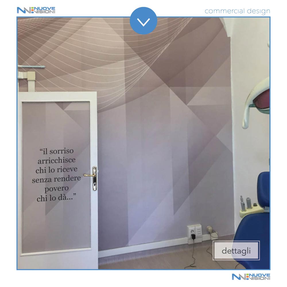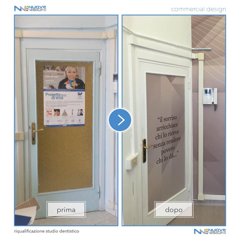 Anche la porta di ingresso, che separa opportunamente le due aree dello studio, è stata rivestita con la stessa pellicola, stampata con il medesimo motivo astratto, ma personalizzata con un aforisma.